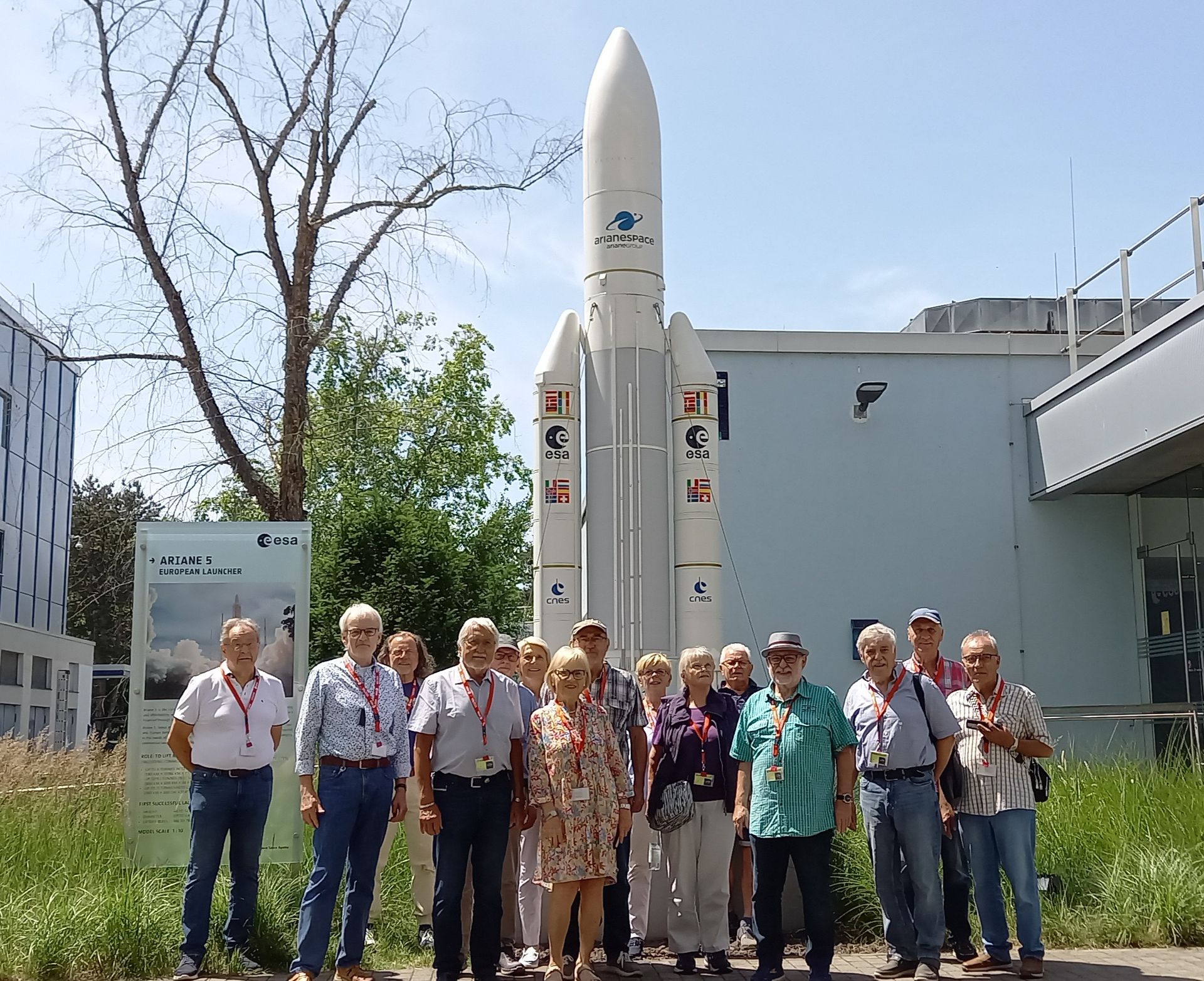 Unsere Gruppe bei der ESA / ESOC in Darmstadt Juni 2025 vor dem Modell der Ariane